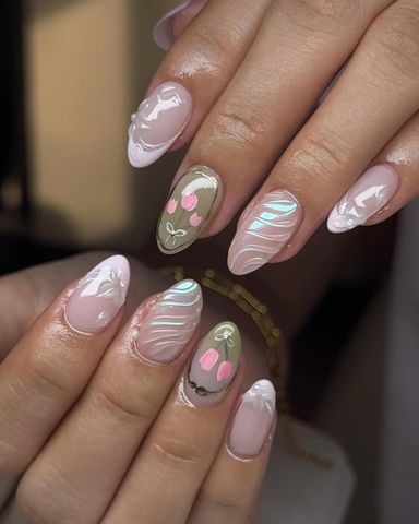 De tonos pastelConsejos francesesun patrón de mármol verde terroso, o un suave lavado con aspecto de acuarela en ambos tonos, las uñas de matcha fresa son igualmente terrosas y dulces. Además de tomar inspiración de las tiendas de matcha, hace referencia a la creciente vegetación y los ramos de flores tan característicos de la primavera. Hay muchas formas sutiles de probar este look: piensa en cuadros de cuadros pintados con esmaltes translúcidos, o una capa translúcida de cromo con reflejos verdes sobre un esmalte rosa palo.