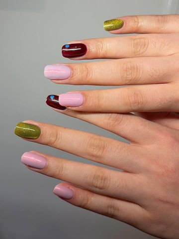 Si necesitas un extra de cafeína, es el momento de pedir un matcha con espresso (para los que no lo saben, es un matcha con una dosis de espresso). Esta manicura incluye uñas con esmalte de espresso junto con esmaltes de bebé rosa brillante y verde intenso.