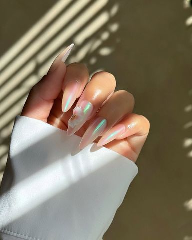 Para una versión sutil de la tendencia, elige un esmalte de rosa pálido con una capa translúcida de polvo de cromo encima. Este cromo tiene reflejos verdes que brillan bajo la luz solar (cada vez más presente).