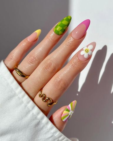Puntas francesas rosa chillón, un patrón cuadriculado verde groovy, margaritas sonrientes y un diseño de molino de colores rosa y verde gritan diversión de primavera. Obtendrás un impulso de energía solo mirando este conjunto vibrante.