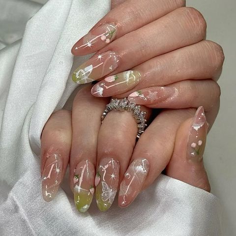 Este conjunto soñador incluye una ola de nubes, brillo y fresas, todas flotando sobre capas translúcidas de esmalte rosa y verde. Las etiquetas de mariposas añaden un toque de estar con la cabeza entre las nubes.