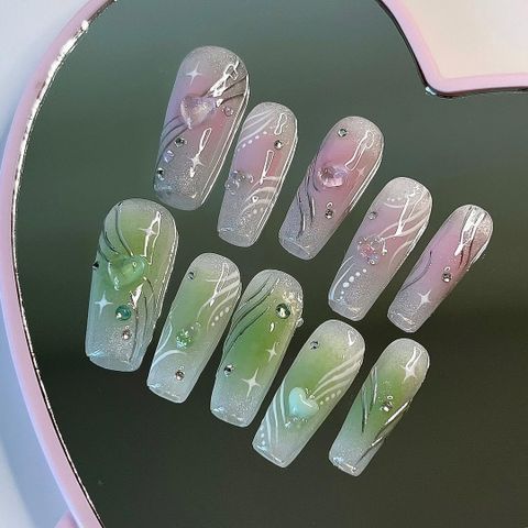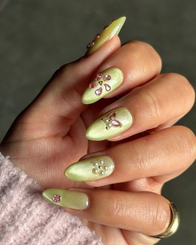 Para una manicura desigual que aún se sienta cohesiva, elige el mismo diseño en rosa en una mano y en verde en la otra. Acentos de cromo plateado y piedras preciosas esparcidas a lo largo de toda la conjunto la unen.