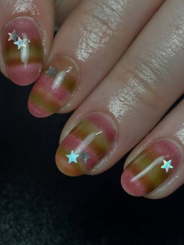 Rosa leche y verde forman un combinado muy dulce, especialmente cuando se decoran con estrellas y puntos. Para evitar que el diseño parezca demasiado frívolo, evita una forma de uña redonda y opta por una forma clásica de almendra o cuadrada.