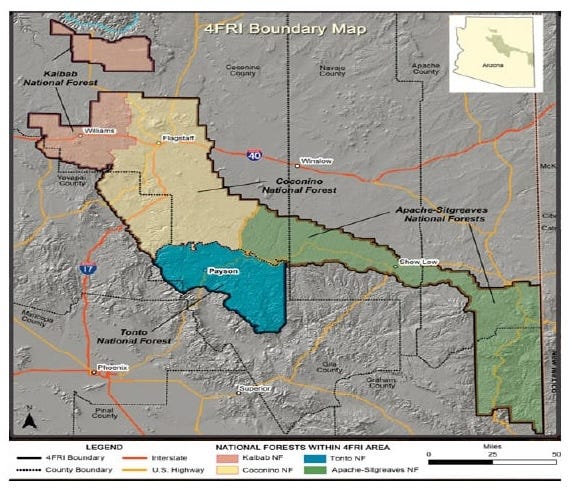 Reconhecendo isso, agências de gestão de terra e defensores da floresta lançaram a Iniciativa de Restauração das Quatro Florestas em2010, visando a reintrodução de queimadas controladas nas áreas de pinheiro-ponderosa em Arizona espalhadas porFlorestas Nacionais Apache-Sitgreaves, Coconino, Kaibab e Tonto.