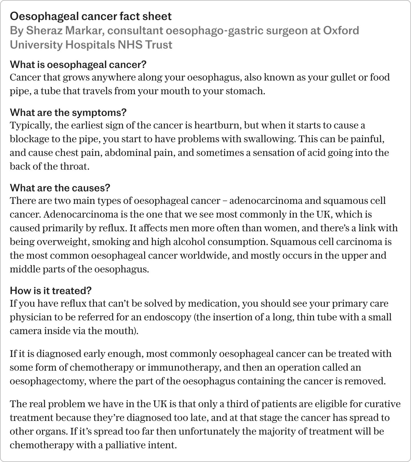 El éxito del tratamiento significaba que ahora podía someterme a una esofagectomía, que implicaría que se desinflara mi pulmón derecho y se me retiraran seis pulgadas de mi esófago. Es una cirugía de alto riesgo, con una alta posibilidad de complicaciones como coágulos sanguíneos, e incluso la muerte. Lo que realmente me queda en la mente es cuando mi consultor me dijo: “Es una operación grande, pero no opero a la gente a menos que pueda curarla”. A pesar de los riesgos, estaba en las nubes.