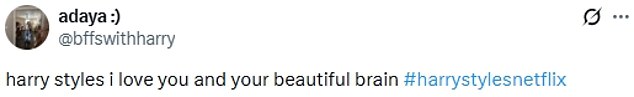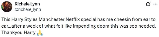 Harry Styles te amo y tu hermoso cerebro”; “Esta especial de Manchester de Harry Styles en Netflix me tiene sonriendo de oreja a oreja… después de una semana que parecía que el fin del mundo estaba cerca, esto era muy necesario. Gracias Harry.