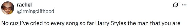 Alabando a Harry, los fans escribieron: “No tío, he llorado con cada canción hasta ahora, Harry Styles el hombre que eres,”;