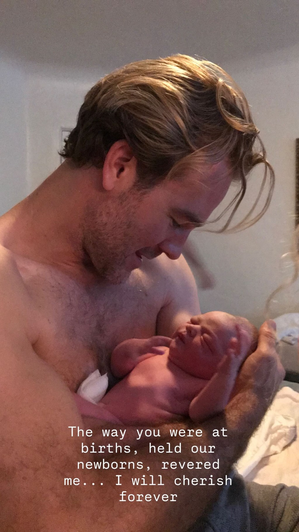Kimberly publicó una foto de James sosteniendo a uno de sus polluelos recién nacido y escribió: “La forma en que estabas al nacer, sostuviste a nuestros recién nacidos, me admiraste… Lo guardaré para siempre.”