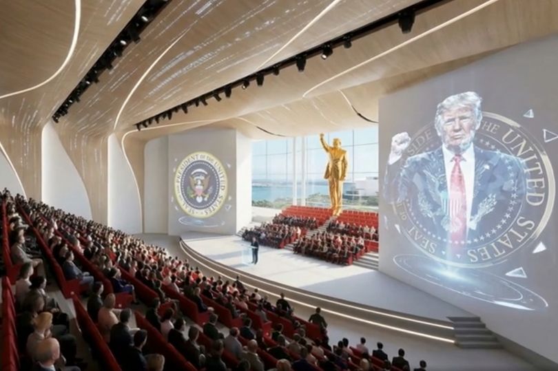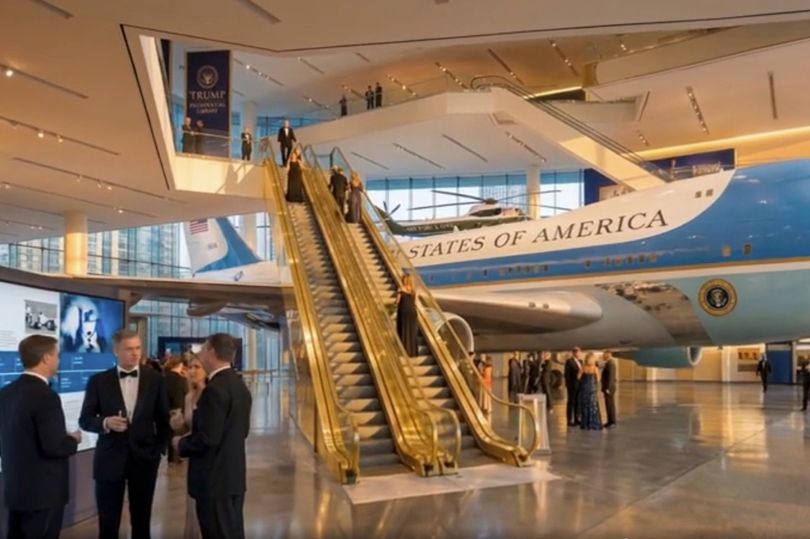 O presidente Donald Trump postou na segunda-feira um link para um vídeo de tour gerado por inteligência artificial de uma biblioteca e museu presidencial imaginada dentro de um arranha-céu em Miami, completo com um avião da Força Aérea Um no saguão e uma disposição de telas estilo aquário que parecem exibir imagens do salão da Ala Leste de sua casa.